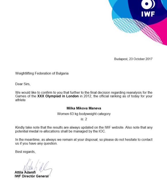 България има още един медал от олимпийските игри в Лондон през 2012 г. Това стана факт, след като на Милка Манева официално бе присъдено сребърното отличие в категория до 63 килограма на турнира по вдигане на тежести.