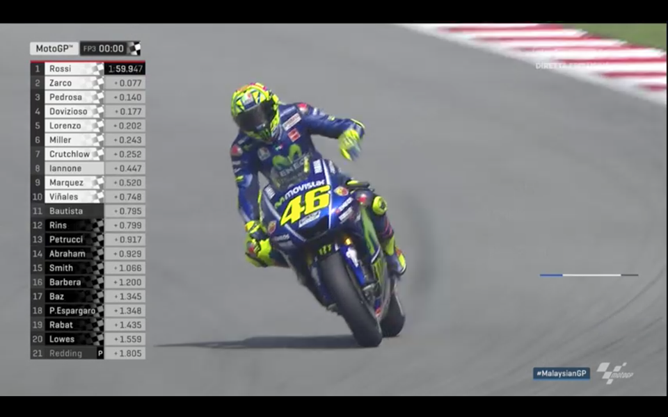 Ветеранът от Yamaha Валентино Роси записа най-доброто време в третата тренировка от състезателния уикенд на MotoGP в Малайзия. Доктора подобри вчерашния еталон на Довициозо от 2:00.671 минути и бе единственият пилот на пистата, който успя да свали времето си под две минути.