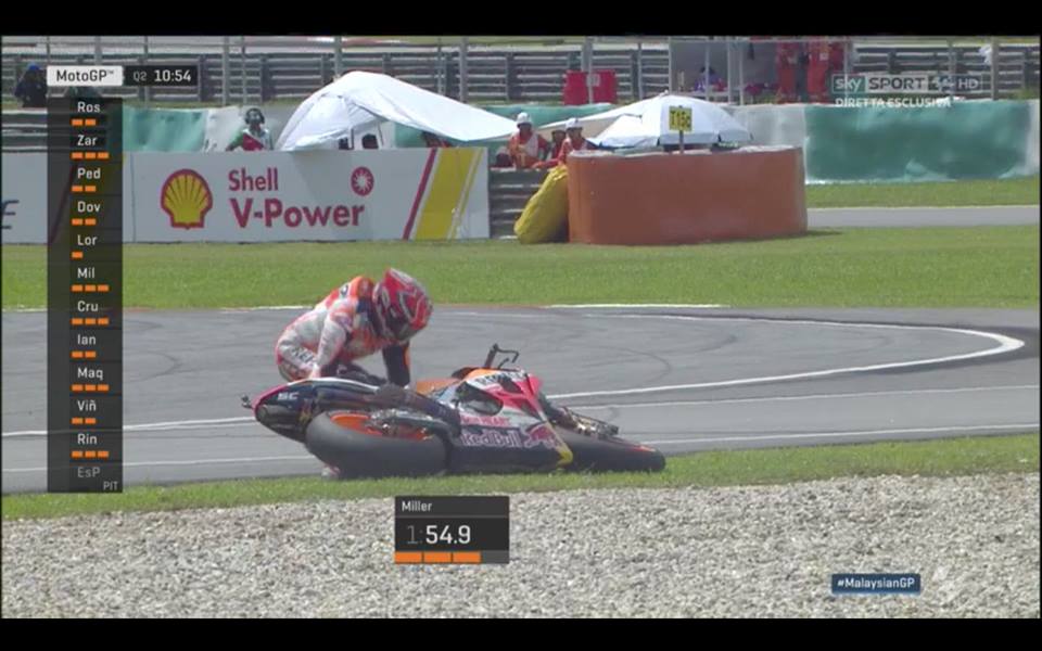 Марк Маркес, който може да спечели титлата за сезон 2017 още утре, катастрофира в началото на сесията и се забави със смяната на моторите си. Инцидент претърпя и сателитният пилот на Honda Къл Кръчлоу, но в заключителната фаза от квалификацията.