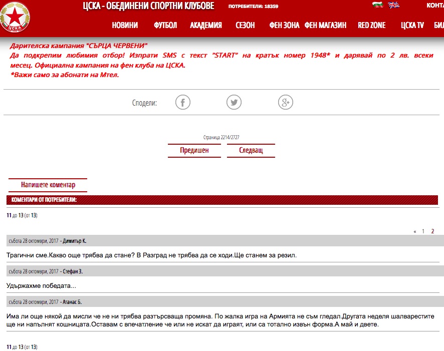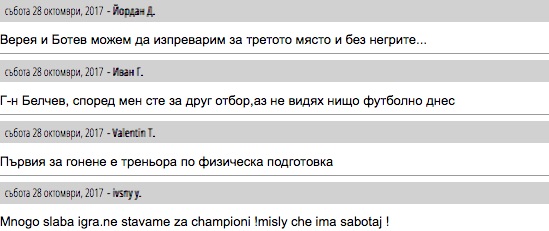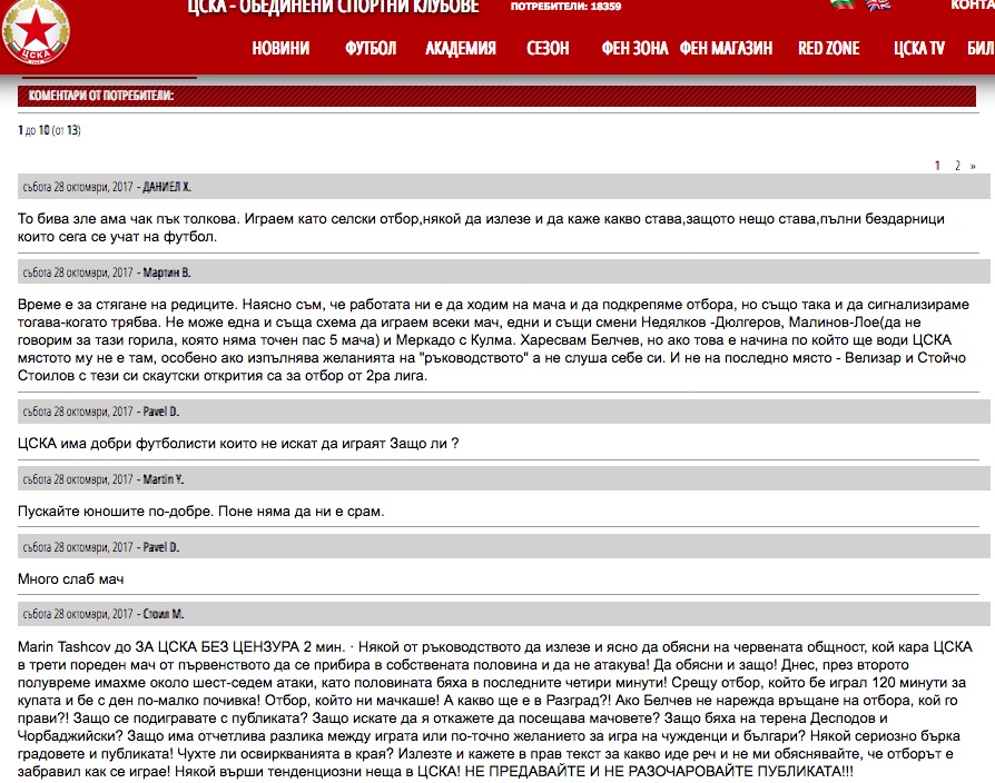 ЦСКА-София спечели с 1:0 домакинството си на Славия в мач от 14-ия кръг на Първа лига, но феновете на тима не останаха никак доволни от продукцията на терена. Футболистите на червените бяха изпратени с освирквания след последния съдийски сигнал, а запалянковците изразиха масово недоволство и под новината за мача в официалния сайт на клуба cska.bg.