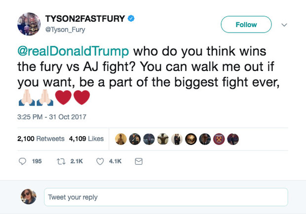 — TYSON2FASTFURY (@Tyson_Fury) 31 октомври 2017 г.