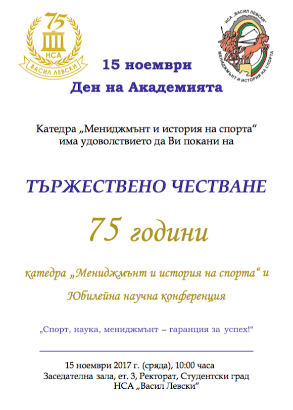 Като прелюдия към тези празнични събития, точно на датата 15 ноември, от 10:00 часа в Заседателната зала на НСА, ще се отбележи Денят на Академията с тържествено честване на 75-годишнината на катедра "Мениджмънт и история на спорта", която днес обучава по една от най-модерните и перспективни специалности "Спортен мениджмънт", както и по магистърската програма "Олимпизъм и спорт".