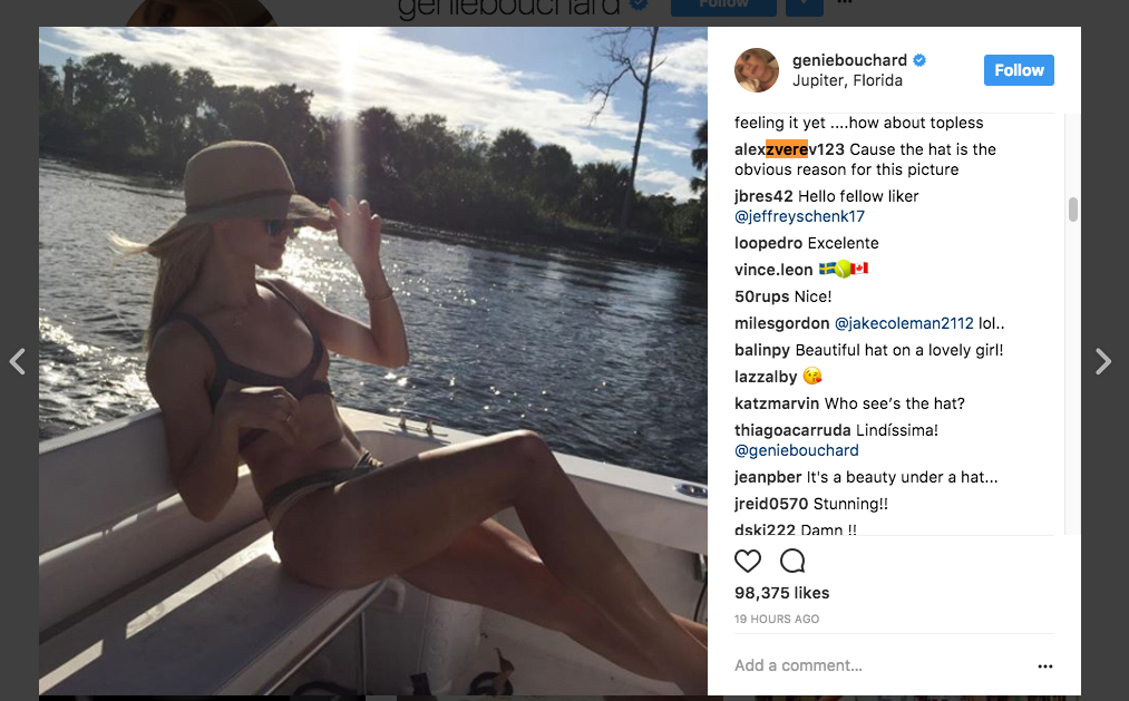 Южени Бушар е сред най-красивите тенисистки и със сигурност е една от най-активните в социалните мрежи. Покрай кошмарните резултати през 2017 година обаче канадката влизаше в заглавията на спортните медии основно със снимките си в “Инстаграм”. Бушар е всепризната за една от големите “кифли” сред женския тур, а колегата й Александър Зверев демонстрира нагледно с коментар под поредния й предизвикателен фотос, че я смята за просто една позьорка.