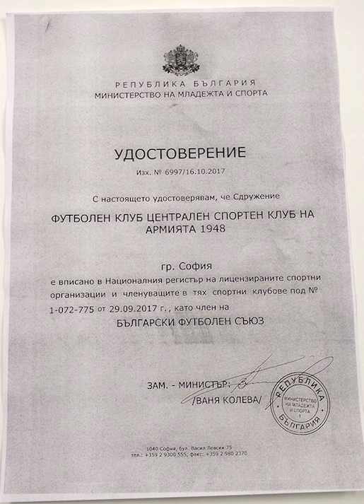ЦСКА 1948 показа документа за членството си в БФС (документи)