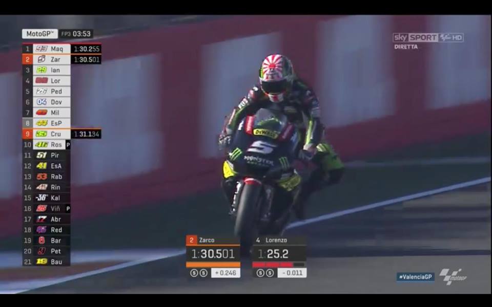 Сателитният пилот на Yamaha и най-добър дебютант на пистата Йоан Зарко бе човекът, който се приближи най-много до Маркес – на 2 хилядни в хода на тренировката – и показа амбиции за полпозишън.