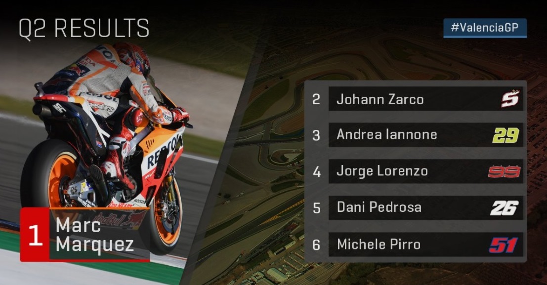 Марк Маркес, който сложи вече едната си ръка върху световната титла за сезон 2017, спечели последния полпозишън за сезона във Валенсия по категоричен начин. Това бе неговият осми за сезона и 73-и в цялата кариера, но въпреки това той катастрофира, като след инцидента не успя да се върне на пистата заради липсата на време. Подобен инцидент претърпя и пилота на Ducati Хорхе Лоренсо, който извади голям късмет, защото можеше да пострада доста по-тежко при падането си.