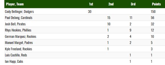 В НЛ призовата тройка след Белинджър попълниха Пол де Йонг (Сейнт Луис Кардиналс) с 56 т. и Джош Бел (Питсбърг Пайрътс) с 32 т. Тук палитрата на номинираните е доста по-пъстра, като точки получиха още цели шестима младоци.