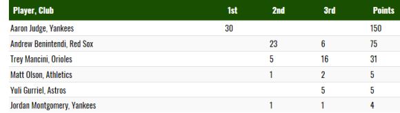 Подгласници на Джъдж в гласуването за АЛ станаха Андрю Бенинтенди (Бостън Ред Сокс) със 75 т. и Трей Мансини (Балтимор Ориолс) с 31 т. Подкрепа получиха още само трима играчи – Мат Олсън (Оукланд Атлетикс), шампионът с Хюстън Астрос Юлиески Гуриел и Джордан Монтгомъри (Ню Йорк Янкис).