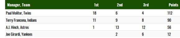 "Да, бях запознат с тази част от историята", коментира с усмивка 61-годишният Молитър, който през изминалия сезон спечели 85 победи с Минесота и класира "близнаците" за плейофите. След него в анкетата останаха Тери Франкона (Кливланд Индиънс) с 90 т. и Ей Джей Хинч (Хюстън Астрос) с 56 т. В осем бюлетини бе посочен и Джо Джирарди (Ню Йорк Янкис), който остана последен с 12 т.