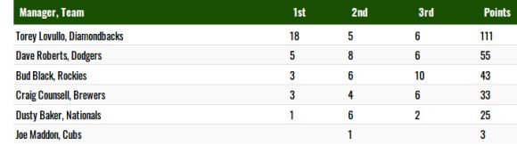 Наставникът на Лос Анджелис Доджърс Дейв Робъртс (55 т.) и този на Колорадо Рокис Бъд Блек (43 т.) попълниха челната тройка в НЛ. Още трима мениджъри получиха подкрепа в гласуването за "старата школа" – Крейг Каунсел (Милуоки Бруърс), Дъсти Бейкър (Вашингтон Нешънълс) и Джо Мадън (Чикаго Къбс).