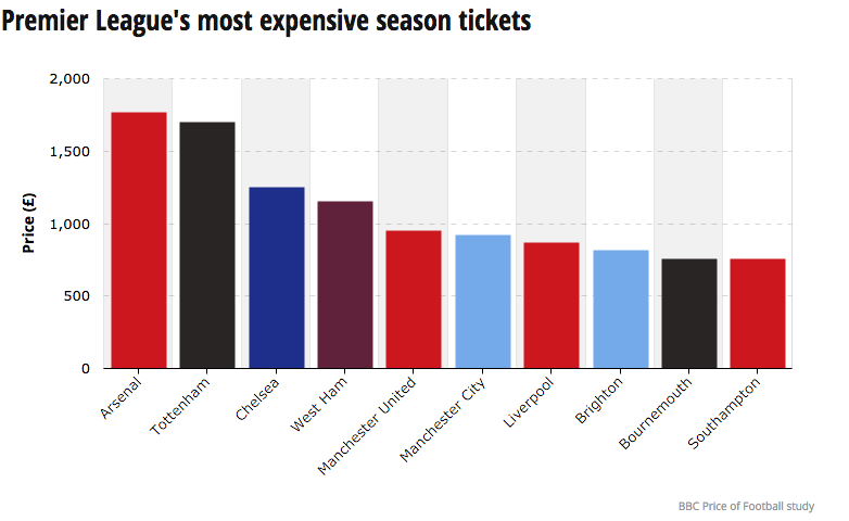 Най-скъпите сезонни карти се открояват в ценовите листи на лондонските клубове. На върха на тази класация отново е Арсенал. 1768 паунда е цената на най-високоструващия абонамент. Следват Тотнъм (1700), Челси (1250) и Уест Хам (1155).