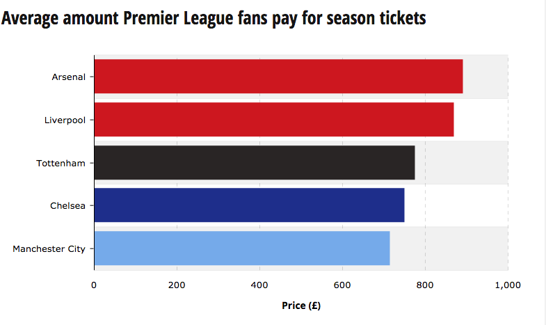 Привържениците на Арсенал продължават и през тази година да плащат най-скъпите сезонни билети в сравнение с всички останали клубове в Премиър лийг. Според годишното проучване на "Би Би Си" средната цена на карта за един сезон, която плащат феновете на "топчиите", възлиза на 891 паунда. Много близо до тях по изразходвани средства са привържениците на Ливърпул, които вадят средно по 861 паунда за същата придобивка.