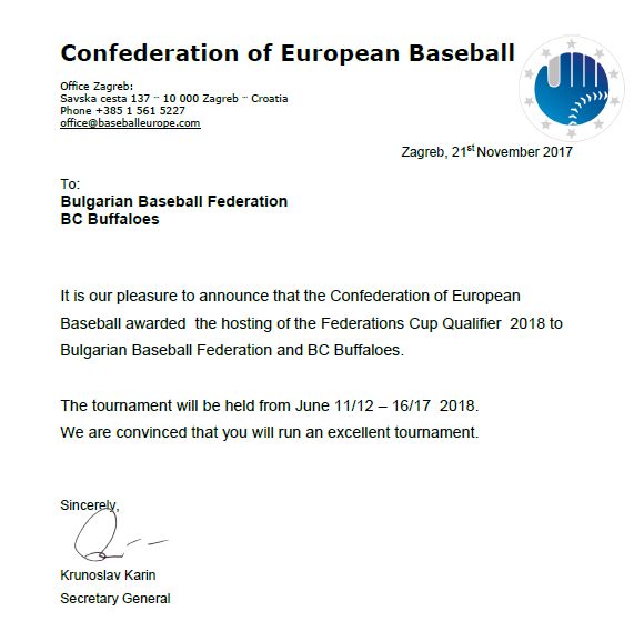 "За нас е удоволствие да съобщим, че конфедерацията на европейския бейзбол възлага домакинството на квалификация за Купата на федерациите през 2018 г. на българската бейзболна федерация и БК Бизони. Турнирът ще се състои от 11/12 юни до 16/17 юни 2018 г. Убедени сме, че ще проведете едно отлично състезание", пише в уведомителното писмо от СЕВ, подписано от генералния секретар Крунослав Карин и получено в БФБ вчера.