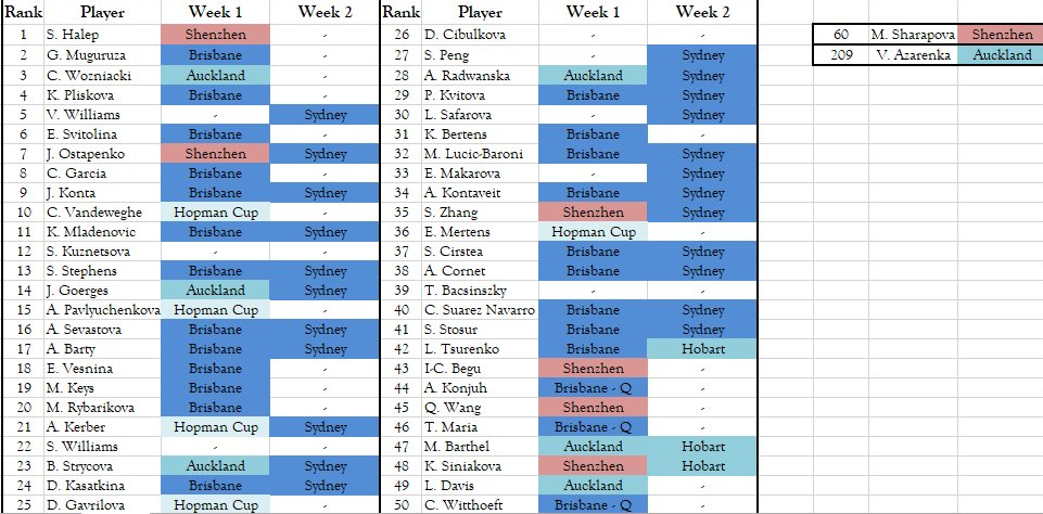 От топ 10 Симона Халеп и Альона Остапенко ще започнат годината в Шънжън, Гарбине Мугуруса, Каролина Плишкова, Елина Свитолина, Каролин Гарсия и Йохана Конта ще участват в Бризбън, а Каролине Вожняцки - в Оклънд.