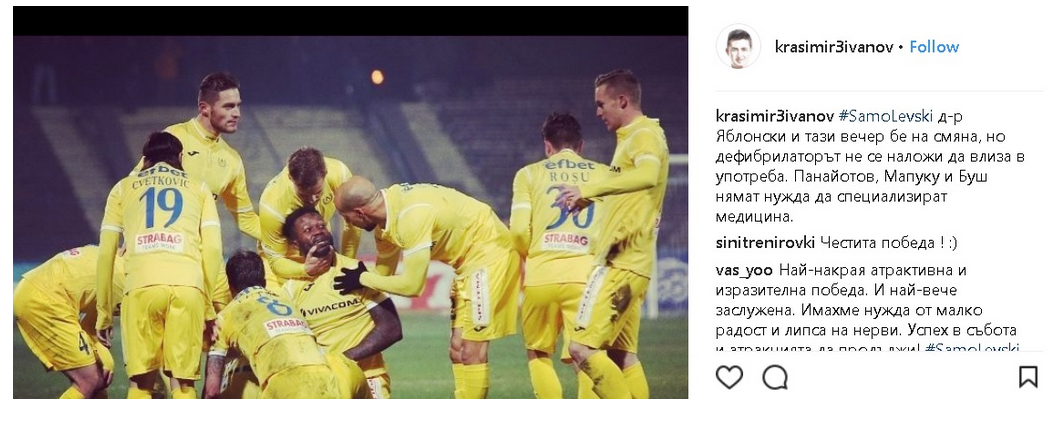 "Д-р Яблонски и тази вечер бе на смяна, но дефибрилаторът не се наложи да влиза в употреба. Панайотов, Мапуку и Буш нямат нужда да специализират медицина", написа Красимир Иванов в социалната мрежа.