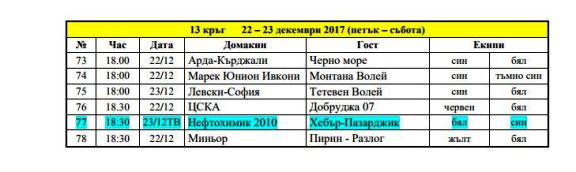 5. Среща №77 между отборите на Нефтохимик 2010 и Хебър (Пазарджик) се пренасрочва от 18,30 часа на 23 декември (събота). Срещата ще бъде с телевизионно излъчване.