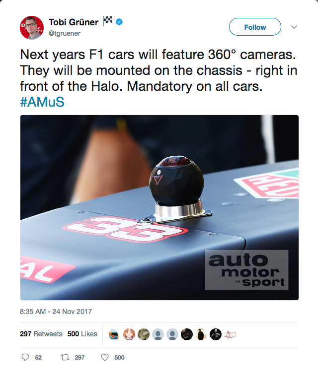 Позициите на камерите, които вече ще бъдат 360-градусови, и тези на огледалата ще бъдат сменени заради новия елемент на болида – т. нар. "ореол".