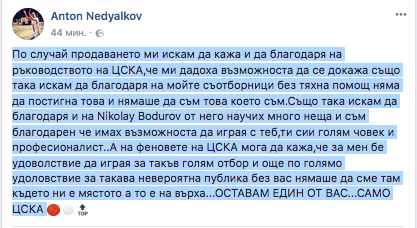 "Също така искам да благодаря и на Николай Бодуров. От него научих много неща. Благодарен съм, че имах възможността да играя с теб, ти си голям човек и професионалист. А на феновете на ЦСКА мога да кажа, че за мен бе удоволствие да играя за такъв голям отбор и още по-голямо удоловствие за такава невероятна публика! Без вас нямаше да сме там, където ни е мястото, а то е на върха! ОСТАВАМ ЕДИН ОТ ВАС...САМО ЦСКА”.
