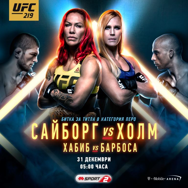 В ранните часове на последния ден за годината Mtel Sport 2 ще предава пряко галавечер 219 на UFC от Лас Вегас. Началото е 5:00 часа, а основният двубой ще противопостави две от най-популярните дами в света на бойните спортове. Крис Сайборг, която доминира през последните години, ще защитава титлата си в категория „перо” срещу Холи Холм – първата жена, победила легендата Ронда Раузи. Внимание заслужава и битката между руснака Хабиб Нурмагомедов и бразилеца Едсон Барбоса в лека категория. Този, който спечели, ще има шанса да се бие срещу Конър Макгрегър или временния шампион Тони Фъргюсън.