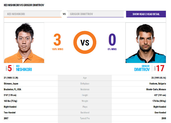 Съперникът, с когото ще играе за титлата - петият в ранглистата на ATP Кей Нишикори, е доста неудобен за Димитров. 17-ият в ранглистата българин все още няма победа срещу японеца, като в трите мача помежду им досега е спечелил едва един сет. И трите им сблъсъка до момента са на турнири от категорията "Мастърс". В Шанхай през 2013 година Нишикори печели с 6:3, 6:4, в Маями през 2014 японецът надделява със 7:6 (1), 7:5, а в Канада през 2016 българинът отстъпва с 3:6, 6:3, 2:6.