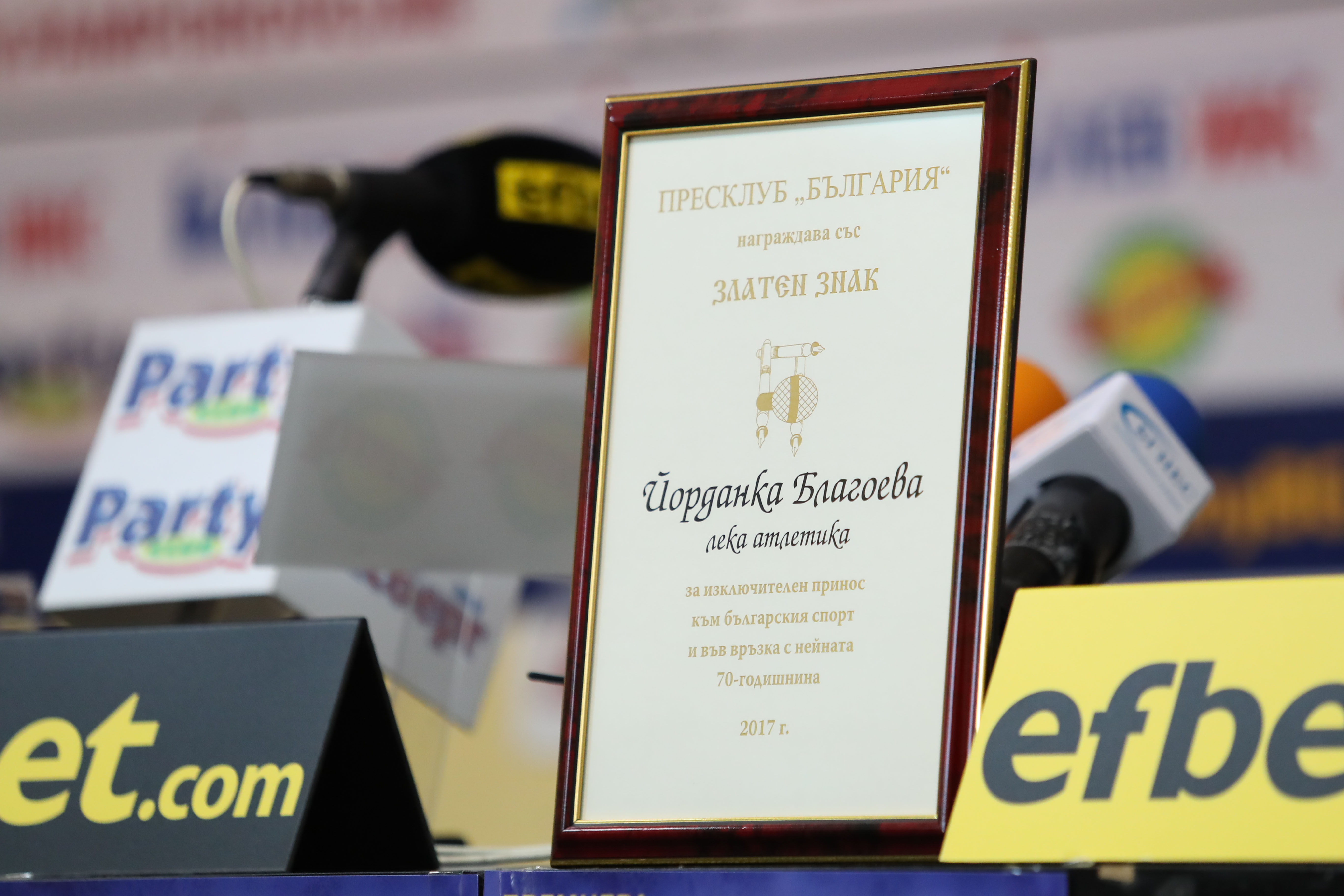 Първата световна рекордьорка на България в скока на височина Йорданка Благоева беше наградена със Златен знак от Пресклуб "България" днес за изключителен принос към българския спорт и във връзка с нейната 70-годишнина, която е в четвъртък (19 януари).