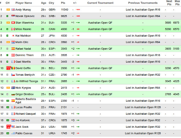 Най-близо до Григор към момента са Раонич и швейцарецът Стан Вавринка, които имат по 450 точки.