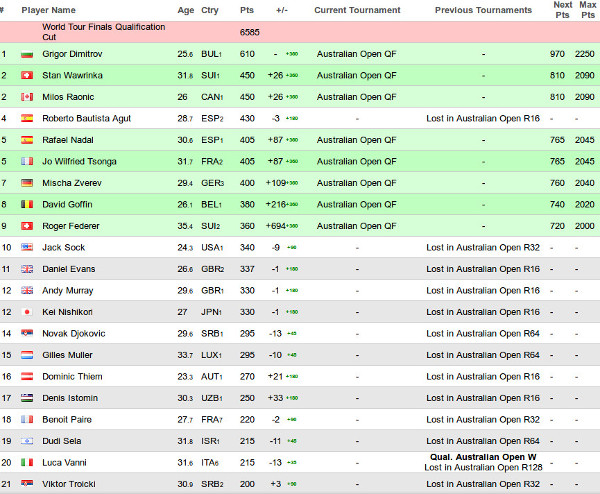 Към днешна дата Григор Димитров е с най-много точки от всички тенисисти в ATP тура през 2017 година. След четирисетовата си победа срещу Денис Истомин на осминафиналите на Australian Open днес 25-годишният хасковлия вече е с 610 точки от началото на сезона. Димитров спечели турнира в Бризбън в началото на месеца, като в австралийския град записа 5 победи. От началото на Откритото първенство на Австралия в Мелбърн Григор има 4 победи. Българинът все още няма поражение през 2017 година, като е загубил само 4 сета в 9-те срещи, които е изиграл. Григор спечели 250 точки с трофея в Бризбън, а с класирането си за 1/4-финалите в Мелбърн прибави към актива си още 360 точки.