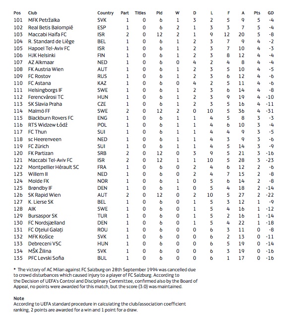 Интересното е, че на последното, 135-о място е българският Левски с единственото си участие в сезон 2006-2007 г. Тогава "сините" станаха първият български отбор, пробил в групите на турнира, но завършиха с 6 загуби в 6-те си мача и голова разлика 1:17. Също без точка и голова разлика -16 е Жилина, но словаците са поставени на 134-о място заради трите отбелязани попадения. Тяхната разлика е 3:19. Дори точка не успяха да спечелят още три отбора - Оцелул, Кошице и Дебрецен, но те имат голова разлика съответно -8, -11, -14.