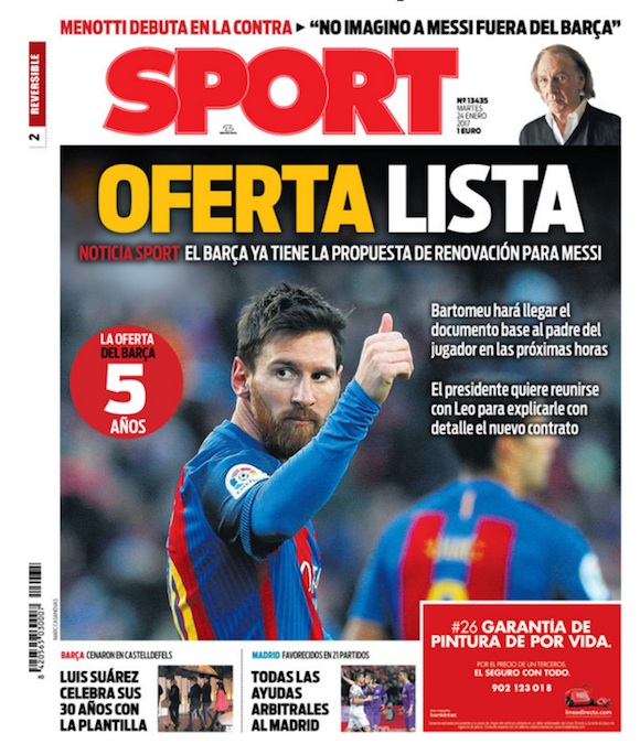 Настоящият контракт на нападателя е до лятото на 2018 година, а предложението на "блаугранас" е той да бъде продължен до 2022 г. Друго важна точка в офертата е, че на Лео ще бъде предложена фиксирана сума като заплата, без в нея да има включени клаузи. Това се прави, за да не има неясноти по предстоящите приходи на Меси, заради които той да бъде обект на разследване от данъчните власти.