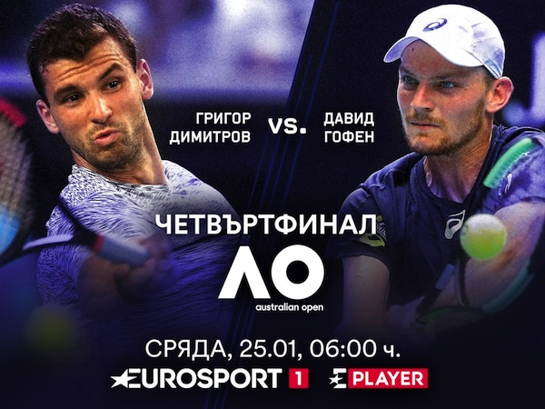 Четвъртфиналът на Australian Open между Григор Димитров и Давид Гофен ще се състои на 25 януари и е трети в програмата на "Род Лейвър Арина". Срещата ще започне около 06:00 часа сутринта българско време и ще се предава пряко в ефира на Евроспорт 1. Коментатори на мача ще бъдат Йордан Божинов и Юлиян Стаматов.