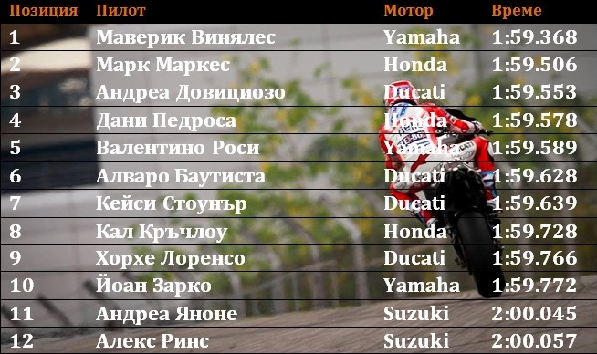 Алваро Баутиста продължи силното си представяне със сателитния отбор и днес, като стана първият пилот начело на класирането с 1:59.628 минути за обиколка, а впоследствие Винялес и Маркес подобриха постижението му.