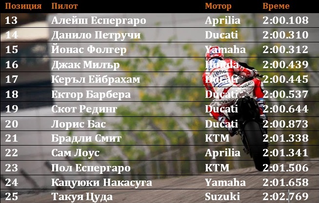 Андреа Яноне имаше серия от падания, за да стигне до 11-ата позиция, с една преди другия най-добър дебютант Алекс Ринс, който се възстановяваше от тежка контузия във врата след катастрофа във Валенсия. С днешното си време Яноне излиза на второ място при комбинирани времена от трите дни зад Винялес.