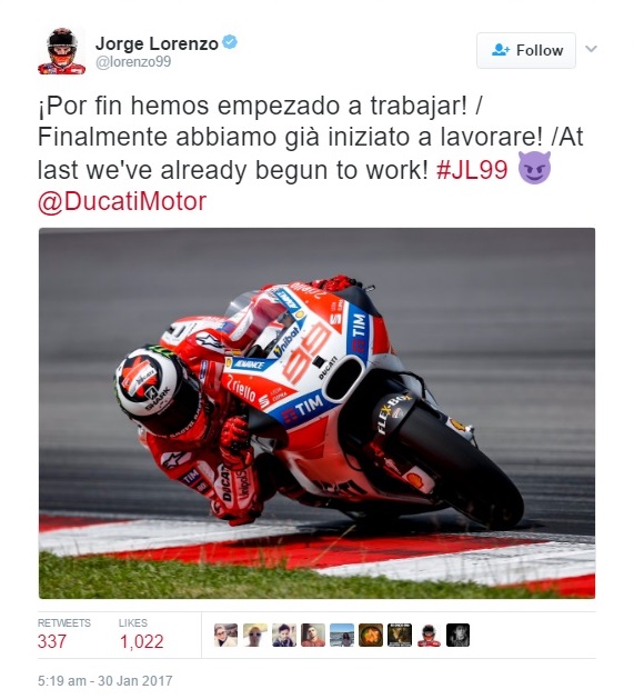 В първия ден от тестовата сесия на "Сепанг" Лоренсо финишира 17-и и както той, така и екипът му бяха учудени и леко стреснати. Лоренсо заяви, че с Yamaha е използвал спирачките много по-рано, отколкото с Ducati и оттам идва загубата във времето.