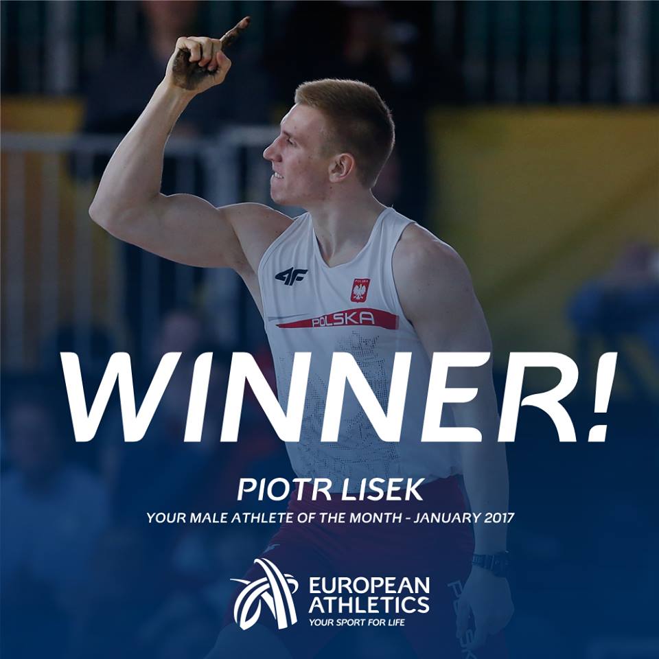Айрине Палсите и Пьотр Лисек бяха избрани за Атлетка и Атлет №1 в Европа за месец януари в анкетата на Европейската атлетика на страниците във Фейсбук и Туитър. Литовката, която е сребърна медалистка в скока на височина от Европейското първенство в Амстердам през миналата година заедно с Мирела Демирева, подобри националния рекорд на страната си, след като скочи 2.00 метра във Вилнюс на 28 януари. С този резултат тя оглави и световната ранглиста за годината. Полякът Лисек, който е бронзов медалист в овчарския скок от Световното първенство на открито в Пекин през 2015 г. и от планетарния шампионат в зала в Портланд през 2016 г., оглави световната ранглиста за сезона, след като постави национален рекорд от 5.92 м в Котбус на 25 януари. На 4 февруари полякът подобри това свое постижение и стана най-новият член на "Клуб над 6 метра", след като скочи точно 6.00 м в Потсдам.