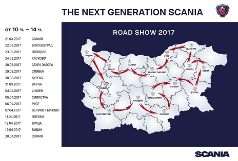 По време на събитието THE NEXT GENERATION SCANIA Road Show 2017, което ще се проведе от 21 март до 20 април в няколко града в България, клиентите на марката ще могат да се запознаят с цялостното портфолио от услуги на Scania, да видят отблизо представителите на Next Generation от S и R серия, и дори да направят тест-драйв с тях.