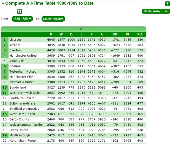 Рекордьорът по титли Манчестър Юнайтед е едва на четвъртото място според тази класация, като събира 5232 точки, а първата десетка попълват още Астън Вила, Челси, Тотнъм, Манчестър Сити, Нюкасъл и Съндърланд.