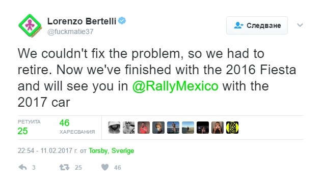 Италианецът Лоренцо Бертели се похвали в социалните мрежи, че на предстоящото рали Мексико (9 - 12 март) ще направи дебюта си с автомобил от новото поколение във WRC. Той ще кара Ford Fiesta с новите специфики, подобно на Ожие и Танак.