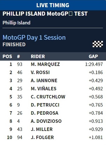Новите производители в кралския клас KTM продължават развитието си, като Пол Еспергаро завърши сесията на 17-о място от общо 22 пилоти на пистата. Тестовете продължават още два дни.