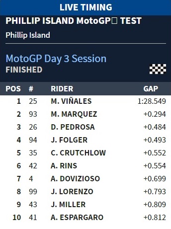 Новият мотоциклетист на Yamaha Маверик Винялес остана най-бърз и след предпоследния предсезонен тест от MotoGP на "Филип Айлънд". В третия и финален ден той оглави "редицата" с най-доброто време за трите дни - 1:28.549 минути.