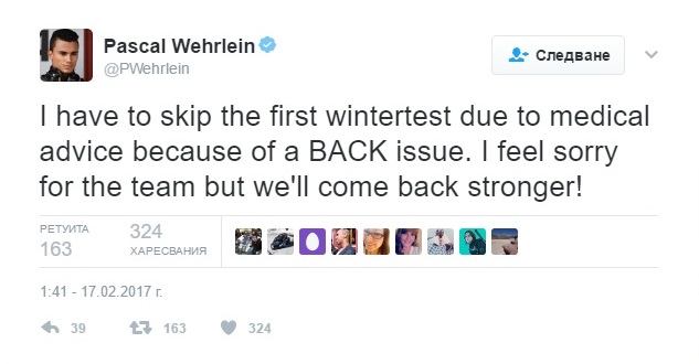 Официално стана ясно, че новият пилот на Заубер Паскал Веерлайн ще пропусне първия от двата предсезонни теста във Формула 1 заради оплаквания в гърба, причинени от катастрофата му в Състезанието на шампионите (ROC) миналия месец.