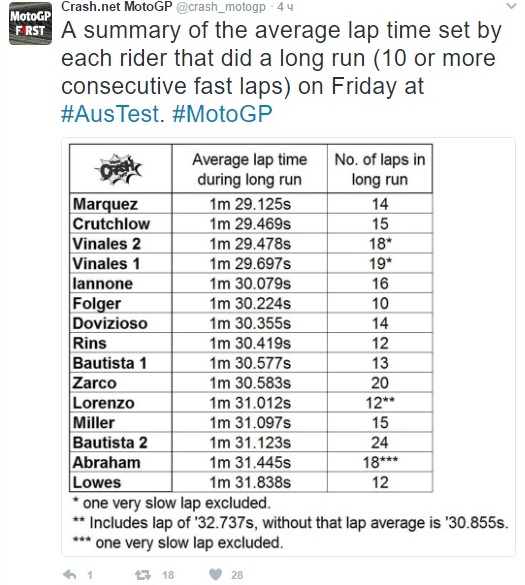 В серия от повече от 10 обиколки Маркес е с най-добро средно време от 1:29.125 минути. Втори изненадващо се нарежда Кал Кръчлоу със сателитен мотоциклет на Honda, а Маверик Винялес, който записа най-бързите обиколки и на трите проведени теста до момента, остава трети при по-дълга серия от обиколки.