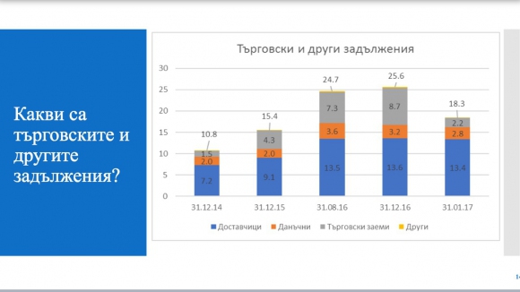 След вчерашното общо събрание на Левски стана ясно, че към 31 август 2016 г. клубът е имал дългове в размер на 24,7 млн. лв., а на 31 декември 2016 г. те са достигнали до 25,6 млн. лева. Месец по-късно се оказа, че дълговете на българския гранд са намалели със 7,3 млн. и са сведени до 18,3 млн. лева. Причината за това е договор с основен спонсор, обявиха от клуба.