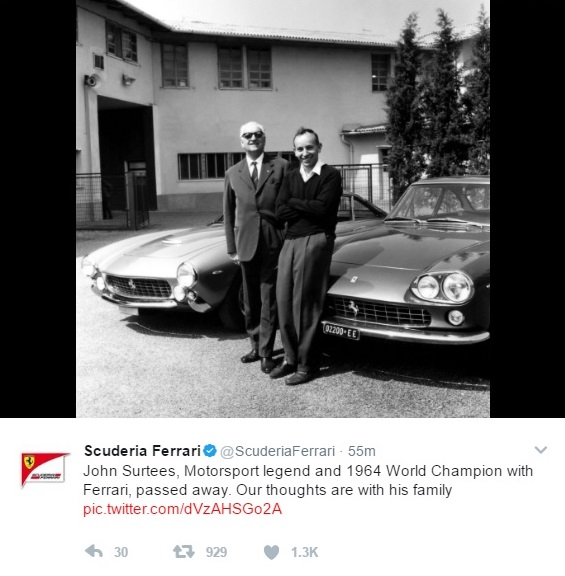 Почина легендарният пилот на Формула 1 Джон Съртис - единственият състезател с титли както в кралския клас, така и във Формула 1. Съртис триумфира с няколко титли при 350- и 500-кубиковите машини на две гуми преди да се прехвърли в болид на Формула 1 през 1960 година, а три години по-късно се присъединява към Ферари.
