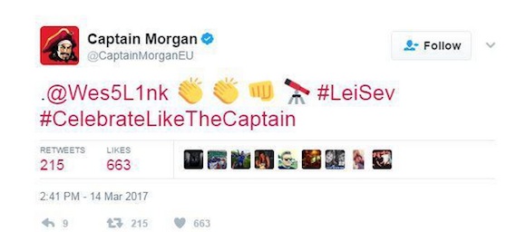 Жестът на Морган, разбира се, се понрави на шефовете на Captain Morgan, които побързаха да го вържат със своя бранд в социалните мрежи. Сега обаче тази публикация може да бъде използвана като доказателство, ако от УЕФА решат, че това е бил преднамерен опит за печалба на техен гръб.