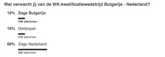 Междувременно "Voetbal international" публикува любопитна анкета, според която 16 % (206 човека) от интервюираните холандци смятат, че България ще победи, други 16% (208 човека) прогнозират равен мач, а останалите 68%(880) вярват в успех на оранжевите.