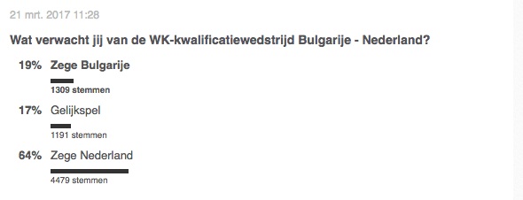 Междувременно феновете на лалетата стават все по-големи песимисти относно двубоя в София. Преди два дни в анкетата на Voetbal International 16 % от тях прогнозираха загуба на техните любимци в България, а днес процентите вече са 19. Други 17% пък смятат, че двубоят в София ще завърши без победител.