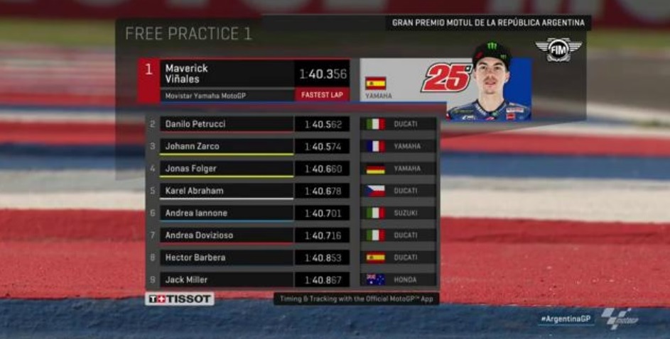 Маверик Винялес продължи силното си представяне със своя нов мотоциклет и оглави първата свободна тренировка за Гран При на Аржентина – втори кръг от календара на сезон 2017 в MotoGP.