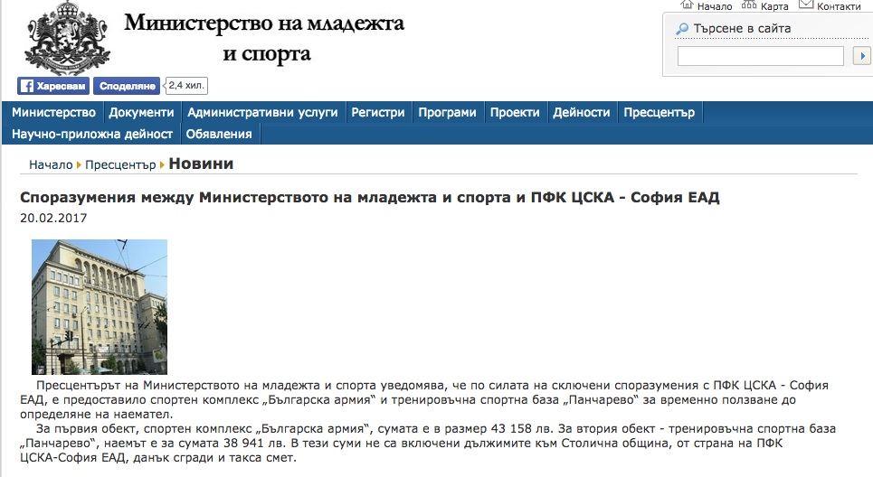 Министерството на младежта и спорта, след допитване до ЦСКА-София, отказа да предостави на Sportal.bg договора за отдаване под наем на стадион "Българска армия" и базата в "Панчарево", който е сключен между ММС и ПФК ЦСКА-София ЕАД". Това се случи на 7 април 2017 г., с решение по заявление за предоставяне на достъп до обществена информация.