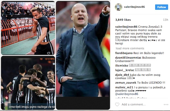 Макар че е в далечен Китай, Валери Божинов следи изкъсо изявите на своя бивш отбор Партизан (Белград). Снощи "гробарите" надвиха Цървена звезда с 3:1 като гости на стадион "Райко Митич" и спечелиха вечното дерби на западната ни съседка. Веднага след края на мача Валери Божинов отправи поздрав към бившите си съотборници в "Инстаграм".