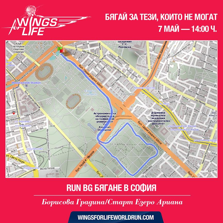Бягането, организирано от Run BG, ще започне от езерото "Ариана", а дължината на трасето, което ще бъде обособено за събитието, ще бъде 5.01 км. Заради уникалния формат на събитието Wings for Life World Run, всеки участник ще може да избяга толкова километри, за колкото е подготвен, а не толкова, колкото е дълго трасето.